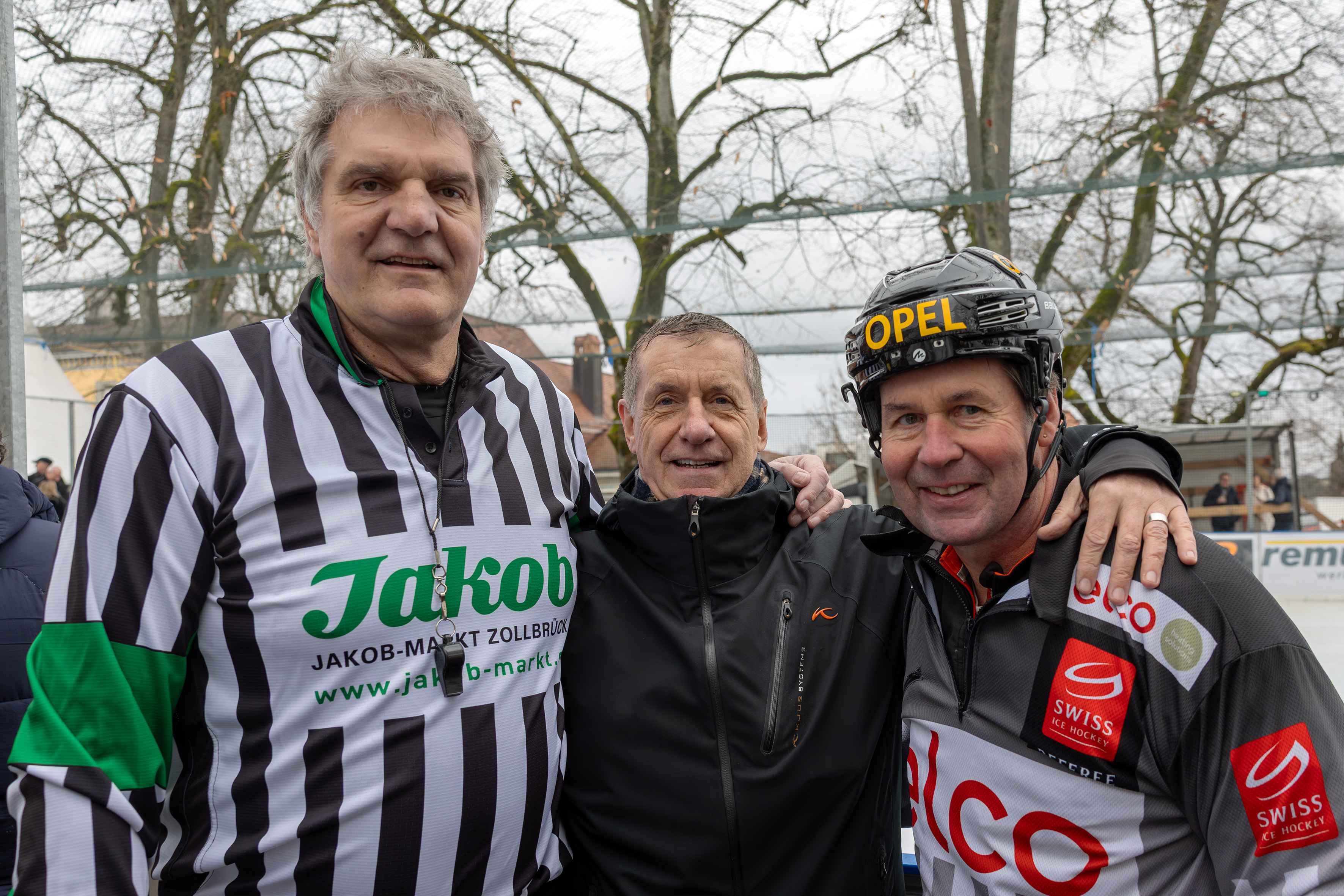 Werner Günthör, Schiedsrichter, Mischu Bauer, Speaker, und Bruno Knutti, Schiedsrichter.