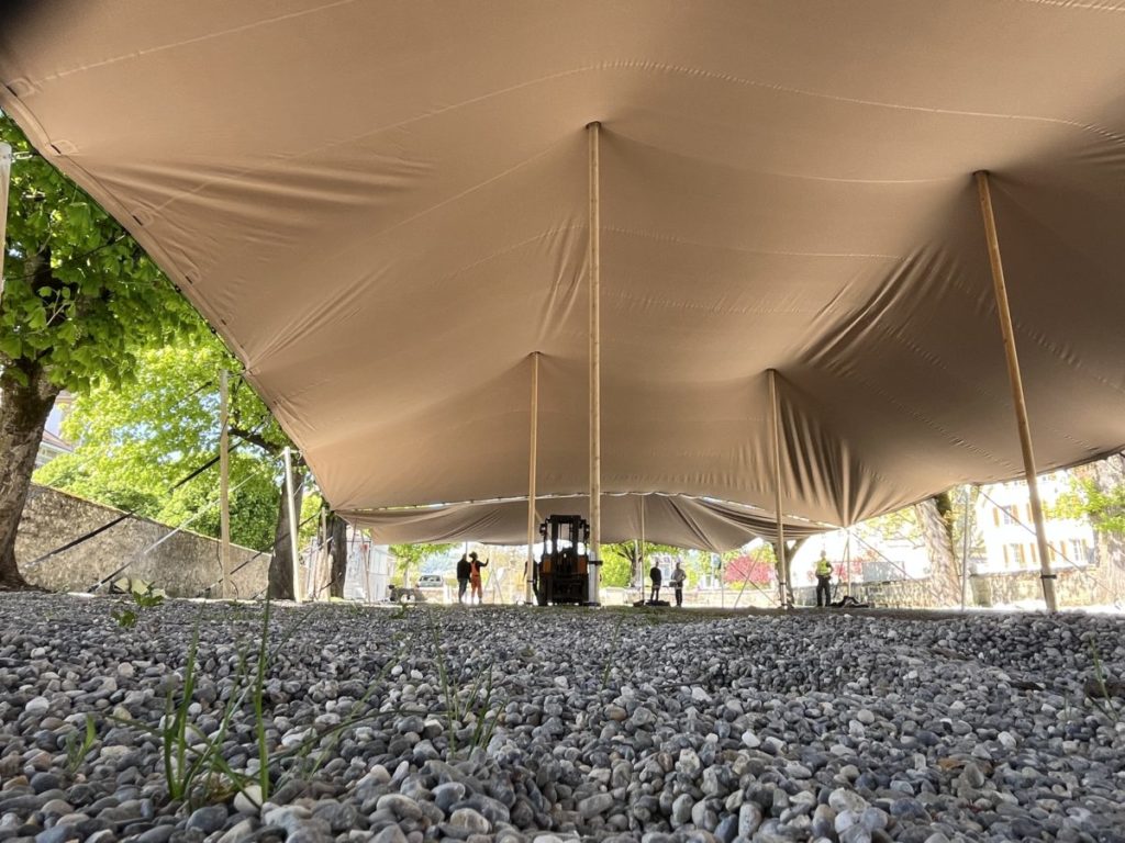 Murten | Seit gestern überdeckt eine Zeltkonstruktion den Alten Friedhof vor dem Murtner Berntor. Unter diesem Dach sollen traditionelle wie auch Jubiläumsanlässe stattfinden.